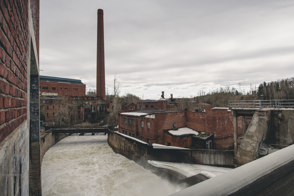 Porteille emme silti mielineet, sillä reissukohteissamme painotus oli sanalla hylätty. Siispä ajelimme niiden ohi tarkastellaksemme näkymiä vesivoimalaitoksen padolta, joka toimii myös siltana Vuoksen länsirannalla asuville svetolaisille. Sillalla kuvaaminen on kiellettyä, se opittiin Svetossa jo edellisellä kerralla (Luovutettu Karjala 2) Markon kanssa. Venäjällähän muun muassa voimaloiden ja muiden strategisten kohteiden kuvaaminen on kiellettyä. Ajelimme kuitenkin padon päästä päähän ja Timo, varoituksistani huolimatta, rohkeni vielä padolle nappaamaan muutaman ruudun muistikortilleen. Osa teollisuusalueestahan on täysin päreinä ja se on nimenomaan sitä padolta hyvin avautuvaa vanhaa puolta, jonka viimeisin omistaja ennen Karjalan luovutusta oli suomalainen valtionyhtiö Enso-Gutzeit.